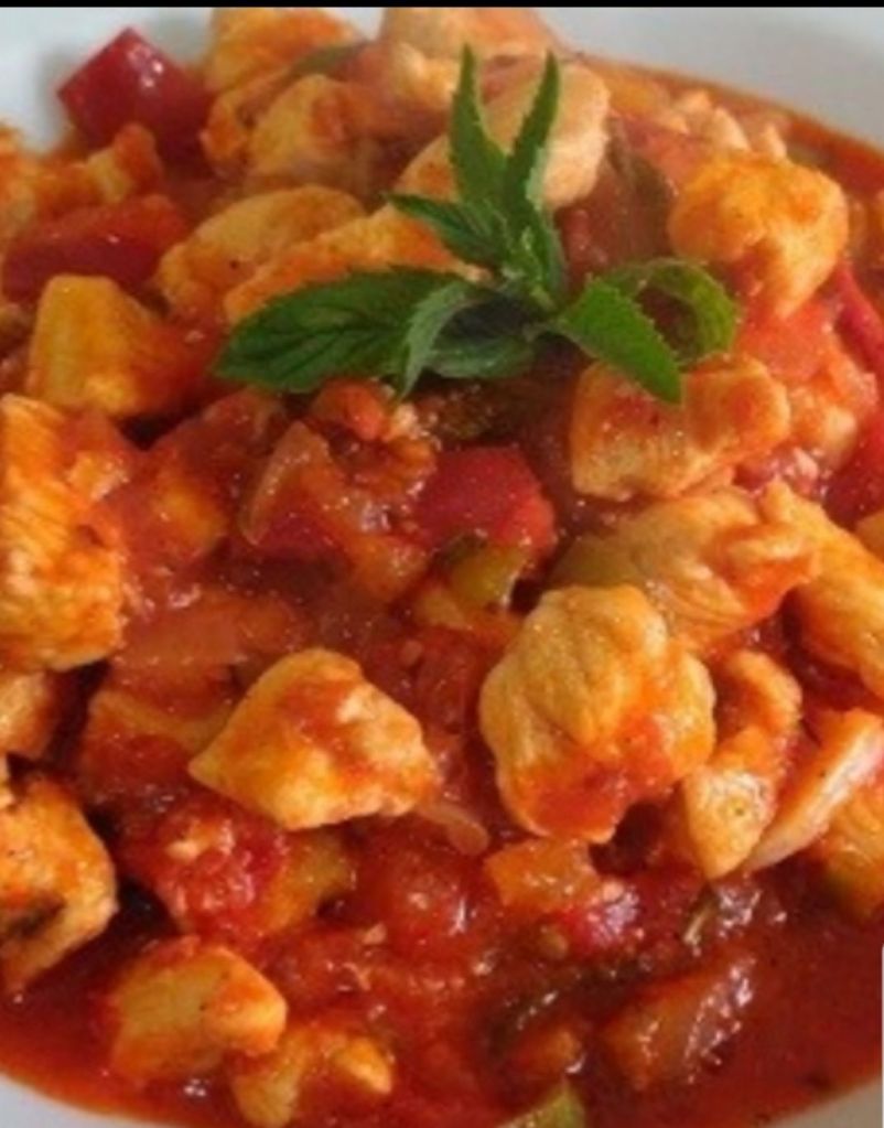 ● نسكب الدجاج في طبق التقديم ونزين بالبقدونس أو أوراق النعنع