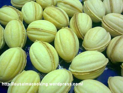 تحشى قطعة الجوزية بالكراميل ونضع معها الجوز واللوز وتطبق فوقها القطعة الثانية