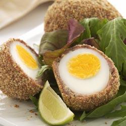 يقسم اللحم أربع أرباع كل ربع تغلف به بيضة مسلوقة.