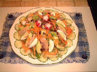في وعاء واسع يقطع الخس والبصل وعند التقديم يوضع الصوص ويقلب مع الخس ويوضع الخبز وترش جبنة بارميزان على الوجه للتزيين