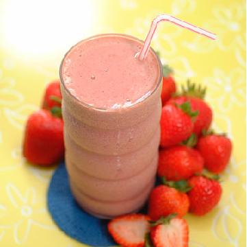 يحتـفظ ببـعض من قطـع الفراولـة و تـوضع في قـاع الكوب ثم يصـب عليهـآ عصير الفراولة و تـزين حافة الكوب بحـبة فـراولة كـاملة