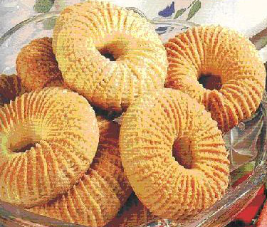 يسكب عليها الزبدة و يخلط جيدا ثم يضاف الماء و يعجن حتى تصبح ملساء و سهلة العجن تكور كريات بمقاس حبة التفاح