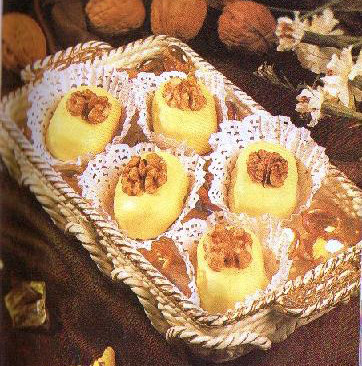 توضع الحلوى في صينية مدهونة بالزبدة ومرشوشة بالدقيق وتطهى لمدة 5 إلى 10 دقائق تطلى الحلوى ثم يوضع فوق كل حبة نصف جوزة