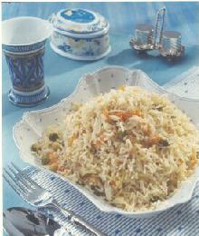 يصفى الأرز ويضاف إلى الخضروات ويقلب على نار قوية لحوالي 2 دقيقة ثم يضاف الملح والفلفل والكزبرة والكمون والقرفة