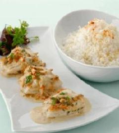 يوضع فيليه السمك المطبوخ في طبقٍ كبير وتُسكب الصلصة عليه ويُقدّم مع الأرز الأبيض