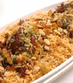 تُوضع في طبق التقديم وتُزين بالبصل المحمر واللوز والزبيب والبقدونس