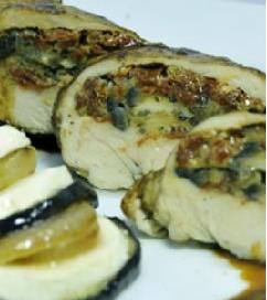 يُفك الخيط وتُترك صدور الدجاج المحشوة لتبرد قليلاً ثم تُقطع وتُقدم مع حلقات البصل والباذنجان المحمر وجبن الموتزاريلا