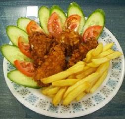 يقدح الزيت ويقلى الدجاج على نار هادئة ويقدم مع البطاطا المقلية