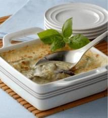يُغطّى قعر صينية بايركس بالقليل من صلصة البشاميل ثم توضع طبقة من الكوسا الخضراء ثم الصلصة البيضاء ويليها الباذنجان ثم طبقة ثانية من الصلصة البيضاء ثمّ الكوسا الصفراء