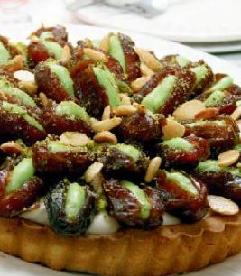 تسكب القشطه الطازجة فوق التارت ثم تصف فوقها حبات التمر المحشوة بطريقة مرتبة