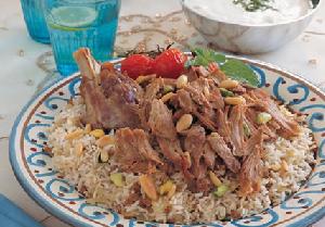يُسحب عظم لحم الغنم ويُنسَّق اللحم فوق الأرز ثم يُزيَّن الطبق بالمكسرات المقلية