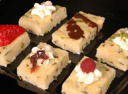 عند التقديم تُزين الحلوي بالكريم شانتيه أوالقشطة مع الفاكهة الطازجة و مربى الورد وفستق مجروش أو أي تزيين حسب الرغبة