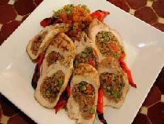 تحضر صدر الدجاجة العريض وتوضع الخلطة بداخله ثم يلف الصدر ويغلق بإحكام ويمكن استخدام الأعواد الخشبية الصغيرة في إغلاقها