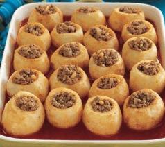تُحشى البطاطا المقلية بمزيج اللحم وتوضع جانباً