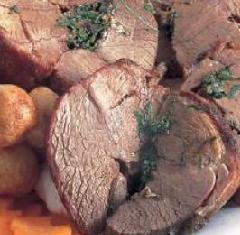 يوضع اللحم في صينية ويصب فوقه مزيج الزيت والعصير ثم يخبز من دون غطاء في فرن حرارته 350 درجة فهرنهايت أو 180 درجة مئوية لمدة ساعة وربع الساعة أو ساعة ونصف الساعة حتى ينضج اللحم