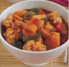 يُضاف مكعّبا مرقة الدجاج ماجي ملح أقلّ، وشرائح الجزر، ومكعبات الفليفلة الحلوة، والأناناس إلى الماء