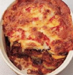 تُسكب ملعقة من صلصة البشاميل في قعر صينيّة للفرن قياس 30 سم × 24 سم وتُوزّع نصف كميّة الخضار المقليّة على الوجه ثم تُسكب صلصة البولونيز مع ثلاثة ملاعق من الجبنة وتُوزّع بقيّة الخضار المقليّة ثم تُسكب أخيراً الكميّة المتبقية من صلصة البشاميل