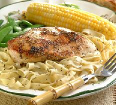 يقدم الدجاج في طبع مع الفيتوتشيني والذرة المسلوقة ويزين حسب الذوق