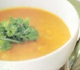 يعاد تسخين الحساء ويزين بالبصل الأخضر أو البقدونس قبل تقديمه