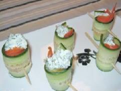 توضع شريحة الخيار ونضع شريحة من السلمون ونلفها وهكذا حتى الانتهاء من الكمية