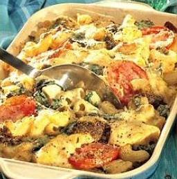تصفى المعكرونة من الماء، ثم تنقل إلى صحن فرن وترش بنصف كمية زيت الزيتون