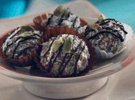 يُقرّص المزيج على شكل كرات صغيرة وتُغمس كّل منها في جوز الهند ثم توضع في قوالب مغلّفة بورق خاص وتُبرّد وتُقدّم