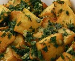 يحمى الزيت في مقلاة وتقلى فيه مكعبات البطاطا حتى تصبح ذهبية اللون