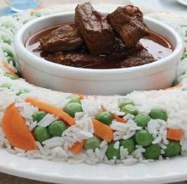 ينقل خليط اللحم إلى طبق التقديم ويقدم مع الأرز المخلوط بالبازيلا والجزر