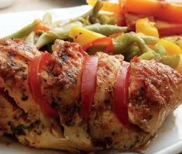 تدهن صدور الدجاج بالزيت ويرش عليها الأوريغانو اليابس ثم تصف في طبق زجاجي مقاوم للحرارة فيه البندورة المفرومة المخلوطة مع الملح والأوريغانو