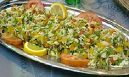 تخلط المعكرونة مع الخضروات المقطعة ثم تضاف التتبيلة وهي(ليمون وملح وفلفل أسود وزيت زيتون ونعناع مجفف وسماق)