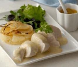 يُصفّ مربع من البطاطا في أطباق التقديم مع قطعة واحدة من صدر الدجاج وتُسكب عليه الصلصة