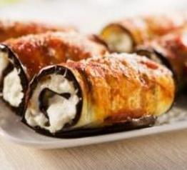 توضع شريحة من الجبن بين شريحتين من الباذنجان، ويضغط عليهما برفق