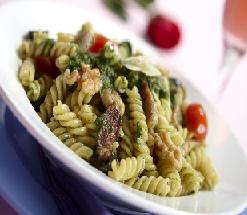 تضاف الباستا إلى خليط الدجاج مع صلصة بستو والحبق الطازج