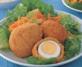 تُغطّى كلّ بيضة بكميّةٍ من عجينة القريدس ثم توضع على صينيّة في الثلاّجة لمدّة ½ ساعة كي تصبح سهلة التغليف