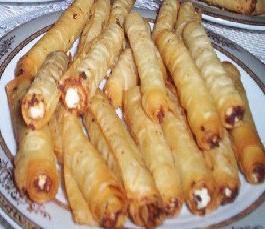 تكور العجينة وتعمل مثل الاسطوانة وتقطع إلى كور وترق كل كرة رقائق وتمد وتعمل بشكل مستطيل وتحشى وتلف بالحشوات السابقة