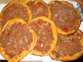 تخلط المواد أعلاه جيدا ثم نأخذ قطع من العجين ونقوم بفردها باستخدام (الشوبك) وتوضع في صينية الفرن وتوضع فوقها كمية معقولة من الصلصة التي قمنا بأعدادها سابقا وتوضع بالفرن مدة عشرون دقيقة حتى تنضج