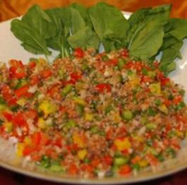 يُخلط الريحان، النعناع، البقدونس، فلفل مشوي، ، الخل، الزيت، عصير الليمون ويُتبل بالملح والفلفل