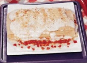 تُسكب الكمية المتبقية من صلصة البشاميل على الوجه وترشّ عليها الجبنة المبشورة