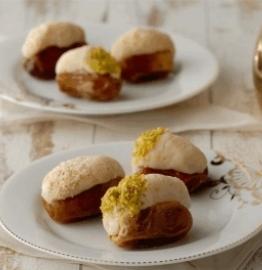 تؤخذ كميّة صغيرة من معجون اللّوز الذي تم تحضيره سابقاً، وتُلفّ بواسطة اليد لتكوّن شكلاً بيضاوياً، وتوضع في داخل حبّات التمر