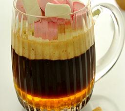 تُصب القهوة كطبقة ثانية، وتُزين بالكريمة المخفوقة وقطع المارشميللو