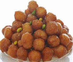 ترفع الكرات من الزيت وتوضع في الشربات (القطر) لبضع دقائق ثم تنشل وتصفى قليلاً من الشربات الزائد، وتُزين بقليل من الفستق