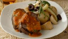 يوضع اللحم والخضار على طبقٍ ساخن وتُسكب فوقه الصلصة
