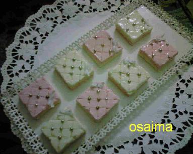 قطعي مربعات خطيها واطليها بالجيلاتين ثم زينيها بالكريات الفضية وعقد الساتان