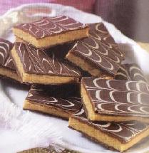 يخرج مستطيل الفول السوداني من الثلاجة و يقلب على الوجه الآخر ويصب عليه ما تبقى من الشوكولا الأسود ويزين بخطوط من الشوكولا الأبيض