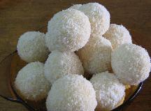 نأخذ مقدار ملعقة صغيرة من العجينة المحضرة ونشكلها على شكل كويرة ونضع بداخلها حبة البندق ونمرها في جوز الهند