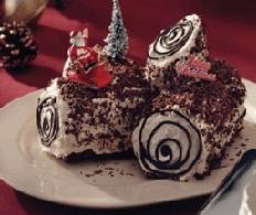 تُدهَن الكعكة بالكريما المتبقّية وتُزَيَّن بالشوكولا المبروشة (يمكن استعمال زينة الميلاد لتزيين الكعكة)