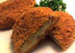 يفرد العجين و يتم تقطيعه إلى 8 قطع مستديرة و يتم تمريرها في الدقيق ثم البيض ثم الخبز المحمص
