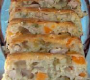 نضيف الباكينج باودر ونخلط جيداً حتى تذوب كل المكونات مع بعض ثم نضيف هذه الخلطة إلى وعاء خلطة الديك الرومي والخضار