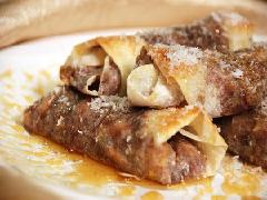 تحشى رقائق العجين الجاهزة بملعقة من خليط الفواكه ثم تلف بشكل اسطواني وتوضع في صينية خاصة بالفرن مدهونة بالسمنة