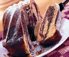 أفرغي ⅔ من العجين في قالب مدهون بالزبدة وأضيفي إلى باقي العجين الكاكاو والحليب والسكر وقطع الشوكولا ثم اسكبيه في القالب